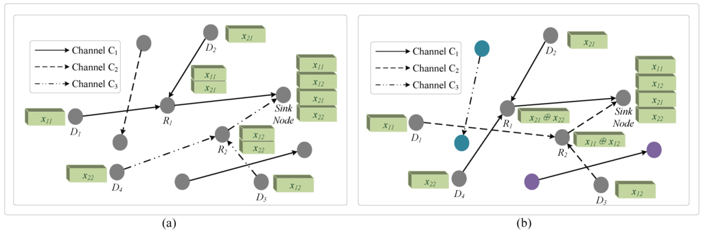 Each sensor node can send exchange data to other sensor nodes adopting the same channel through multiple routes. As shown in Figure 1, each block represents a kind of data in the network, and each sensor node has a data block. Figure 1a shows a traditional transmission method with random channel assignment; the relay nodes receive the data from and , respectively, then forward the data to the sink node. transmit the data to the sink node sequentially through a selected relay node , while and send data through the relay node . We assume that data are relevant to data and data are relevant to data . However, these relevant data cannot be processed by both data fusion and network coding at the relay node to eliminate unnecessary data transmission because they are transmitted differently. To solve this problem, we consider dividing the sensor nodes into different classes according to their data content and assign the same channel for the sensor nodes in the same class. Compared to the traditional approach, the advantage of this method is to decrease the redundant data, improve the channel utilization efficiency and reduce channel congestion during the data transmission. The relay sensor node can process data fusion and network coding on different data during data transmission.