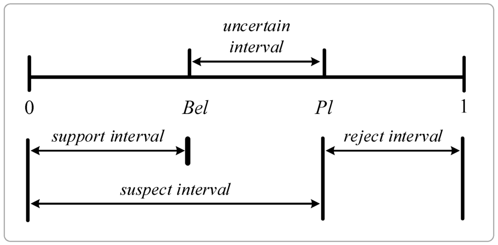 The larger indicates a higher degree of belief, which means the sensor node is more likely to belong to the class. The relationships between the value, the value and the uncertain interval are shown graphically in Figure 2 [,].
