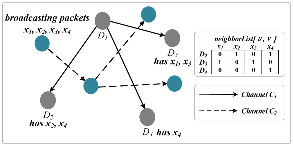 In this work, we use random linear network coding to further improve the data transmission in the millimeter-wave sensor network. It was first proposed in 2006 []. The core idea of RLNC is using the computing power of the sensor nodes. The sending sensor node combines different packets with linear encoding, and the original information packets are restored by calculation at the receiving sensor node after obtaining sufficient linear encoding packets. For example, the sensor nodes , , , are assigned the same Channel 1 as shown in Figure 3, where sensor node needs to send the data packet to , and . Each receiver has partial data, such as has the data , has the data , has the data . Each sensor node has a to record the data contained in the sensor nodes. consists of two parts where μ is the sensor node number and ν is the data number. In Figure 3, the sending sensor node needs to broadcast four times by using the traditional methods. With the help of the RLNC, the sensor nodes have the ability of network coding, and the random coding vector from to the code combination can be used and broadcast, where is the Galois field. After the receiver gets three coding combination packages, it can adopt a linear operation to get the original packets . Compared to the traditional method, the sending sensor node only needs to broadcast three times to finish the transmission by using the RLNC.