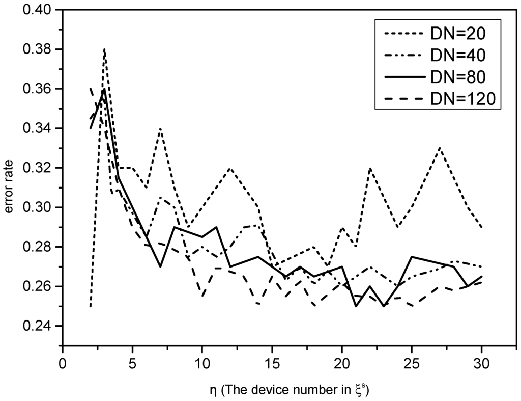 As can be seen from the simulative results, selecting a sufficient number of η is important to reduce the error rate. For all of the different numbers of the training set, the D-S evidence theory’s error rate has a significant change with the growth of η. Although the data have large fluctuations, they show a downward trend. The error rates are similar to the different numbers of the training set, because there are enough sensor nodes in the training set to reduce the volatility. It can be concluded that enough η can reduce the error probability of the D-S evidence theory.