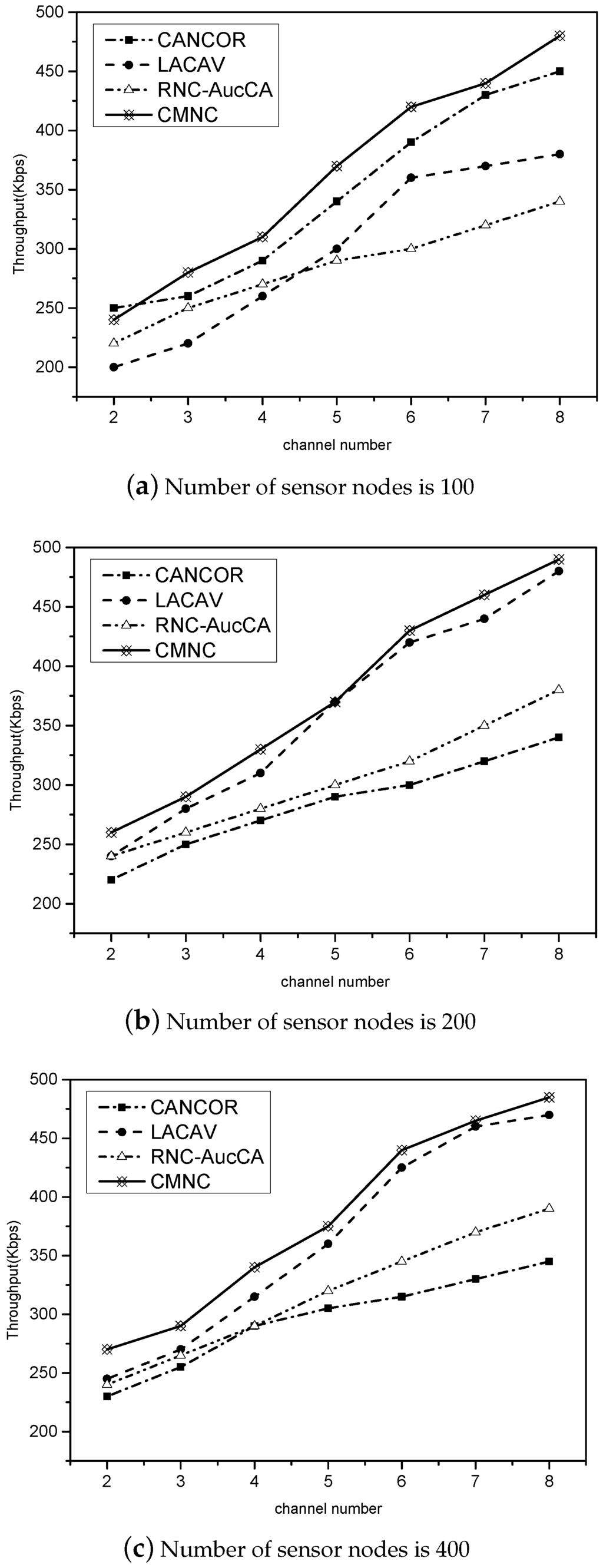 The adjustment of the network throughput is affected by the number of available network channels. In the simulations, we change the channel number from two to eight. As seen from Figure 6, each algorithm’s channel throughput increases with the number of distribution channels and shows a trend of rising with different levels. When the number of channels in the CMNC algorithm is four times greater than before, the network throughput presents double growth. The growths of other algorithms are all weaker than that of the CMNC. The maximum throughput is also varied with the different numbers of sensor nodes. More sensor nodes in the millimeter-wave sensor network under the same number of channels lead to a greater network throughput. It can be concluded that the CMNC algorithm has obvious benefits on the throughput, and it is also affected by the increasing number of sensor nodes.