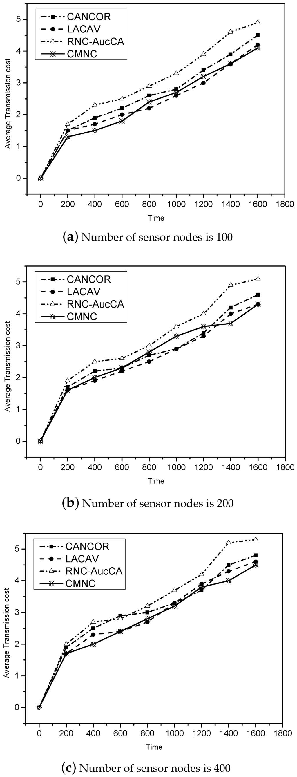 For the average transmission cost, we give the results of these four algorithms’ change over time. As shown in Figure 7, the average transmission cost grows with time. Comparing these four algorithms, the CMNC algorithm spends less average cost than the other three, which shows an obvious advantage. By using the different number of sensor nodes, transmission collisions increase with more existing sensor nodes. A lesser number of sensor nodes can obtain higher average transmission cost in the millimeter-wave sensor network.