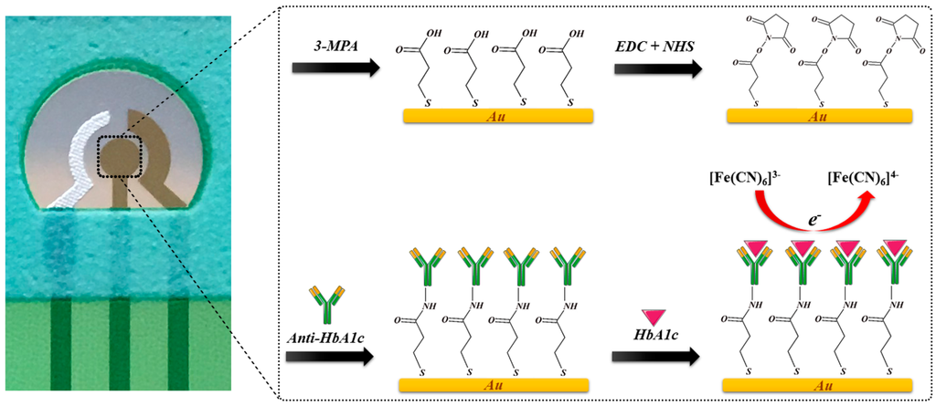 In this study, single-use disposable thin-film gold-based working and counter electrodes were constructed as a label-free HbA1c biosensor. Figure 1 shows a schematic representation of the fabrication steps of this biosensor. Anti-HbA1c was used as a selective HbA1c-capturing probe. Self-assembled monolayers of MPA were employed to covalently immobilize anti-HbA1c on the surface of the gold electrode. Differential pulse voltammetry (DPV) was employed as the electrochemical detection method to enhance the sensitivity through minimization of the charging current. Details of the fabrication processing of the biosensor will be given later.