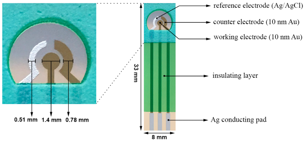 Figure 2 shows the biosensor prototype and its actual dimensions used in this study. The conventional three-electrode configuration consisted of a 10-nm-thin gold film used as working and counter electrodes and a thick-film printed Ag/AgCl reference electrode. Thin gold film was deposited on polyethylene terephthalate (PET) by sputtering technique without any binder and the biosensor was patterned by laser ablation technique. Separate masks were used producing different elements of the biosensor prototype. The Ag/AgCl reference electrode and the insulation layer were thick-film printed using DuPont #5870 Ag/AgCl and Nazdar APL 34 silicone-free dielectric inks respectively. 100 individual biosensors in 4 rows were fabricated on each PET sheet (355 × 280 mm2). The overall dimensions of an individual biosensor were 33.0 × 8.0 mm2. The working electrode area was 1.54 mm2 accommodating 10–15 µL of liquid test sample. The combination of sputtering and laser ablation techniques resulted in producing a very thin and yet uniform gold layer featuring high-reproduction and low-cost at the same time. This promising and unique fabrication technique allowed for mass production of single-use disposable biosensors. More detailed explanation of the electrode fabrication process can be found elsewhere [18].