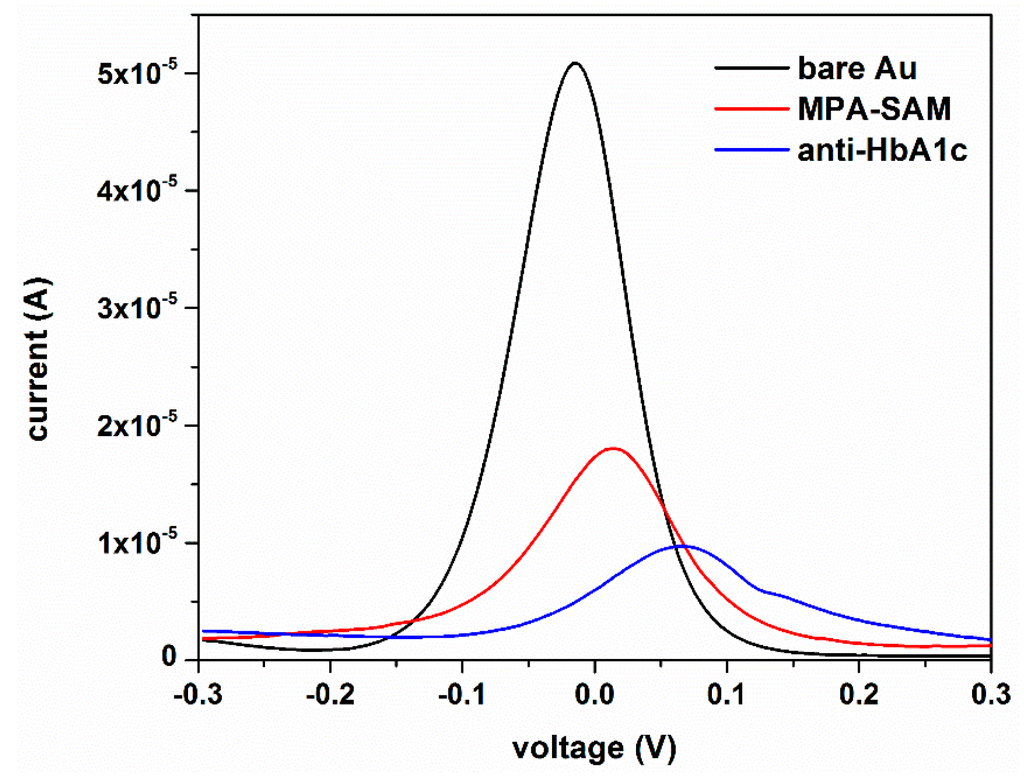 Gradual decrease in the signal generated by K3Fe(CN)6/K4Fe(CN)6 redox couple reaction as a result of MPA-SAM formation and anti-HbA1c (50 µg/mL in 0.1 M PBS) immobilization on the surface of gold electrode.