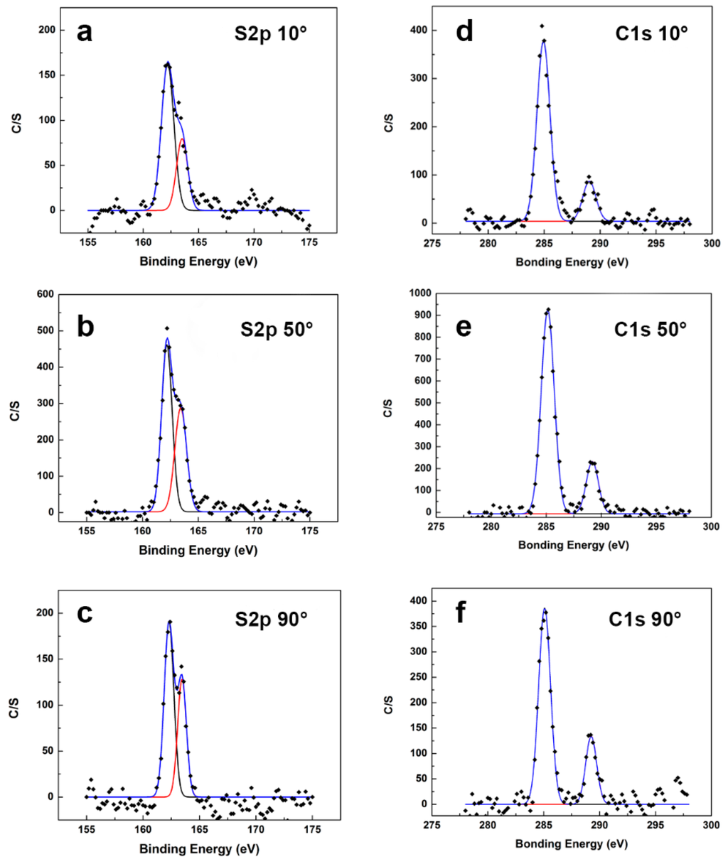 High resolution spectra of C(1s) and S(2p) obtained for MPA-SAM–modified AuE at take-off angles of 10°, 50° and 90°.