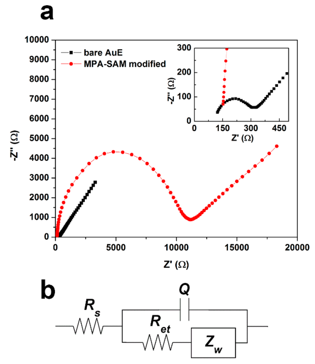 (a) Nyquist plots obtained for the bare and MPA-SAM-covered AuEs in a frequency range of 10−2 to 104 Hz; (b) Randles equivalent circuit used to model the experimental data.