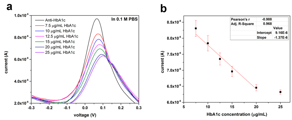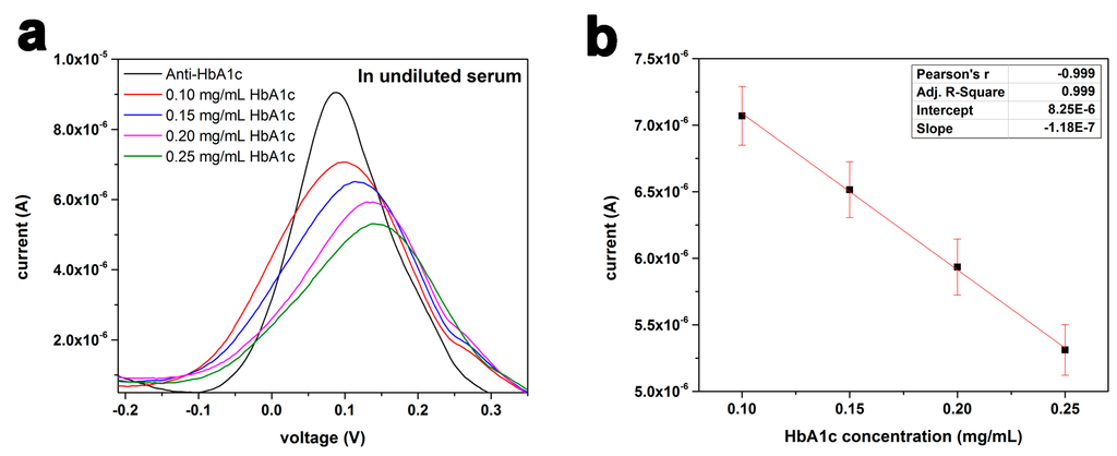 The biosensors for the measurement of HbA1c in serum were used only once for each HbA1c concentration to accomplish the goal of developing a single-use disposable in vitro HbA1c biosensor. Figure 6a,b exhibit the excellent performance of the biosensor for HbA1c detection in serum. The correlation coefficient for linear fitting was 0.999. Measurements of the HbA1c antigen in serum at the concentration level of µg/mL were also undertaken (data not presented). The DPV measurement of the HbA1c antigen in serum at the level of 15–25 µg/mL was good and meaningful. However, the repeatability of the DPV measurements at lower HbA1c antigen concentrations <10 µg/mL were only fair. This might be the lowest detection limit of HbA1c in serum. Nevertheless, the DPV measurements of HbA1c in undiluted serum over the range of 0.10–0.25 mg/mL demonstrated this potential application of the biosensor in diabetic management.
