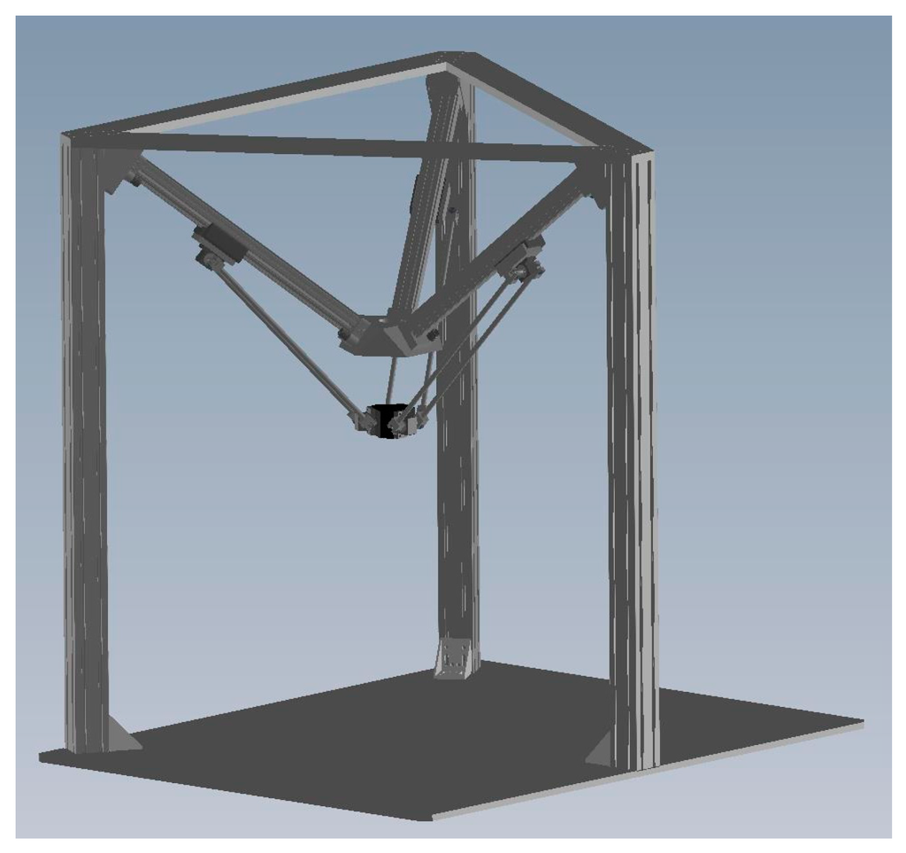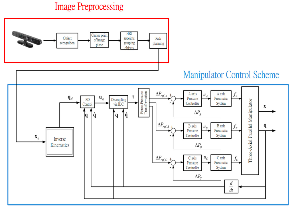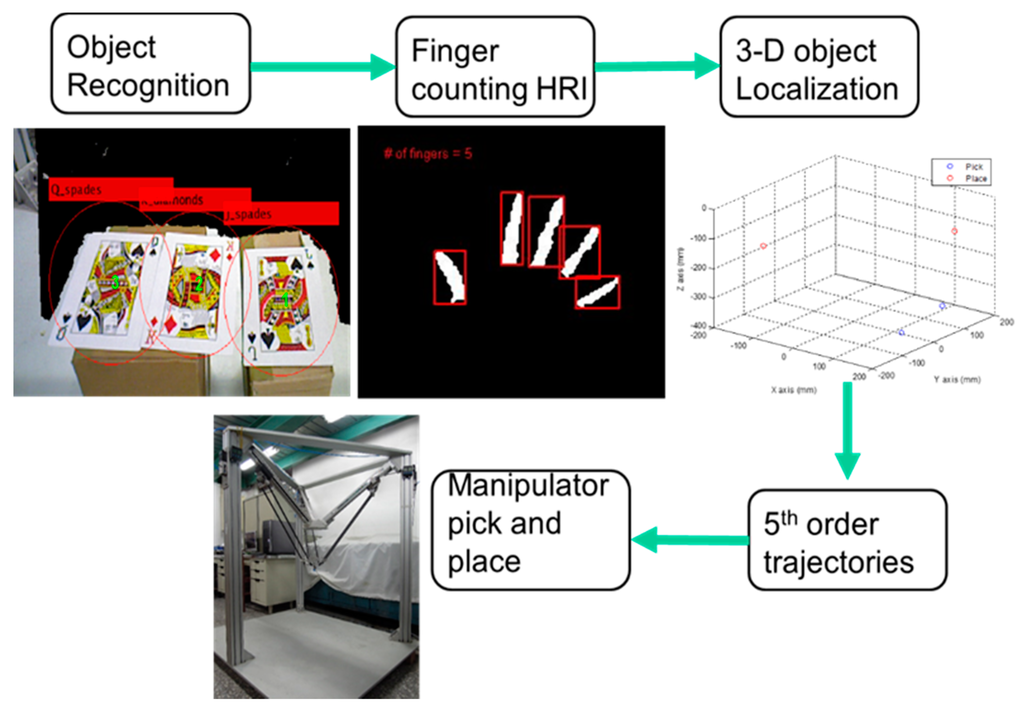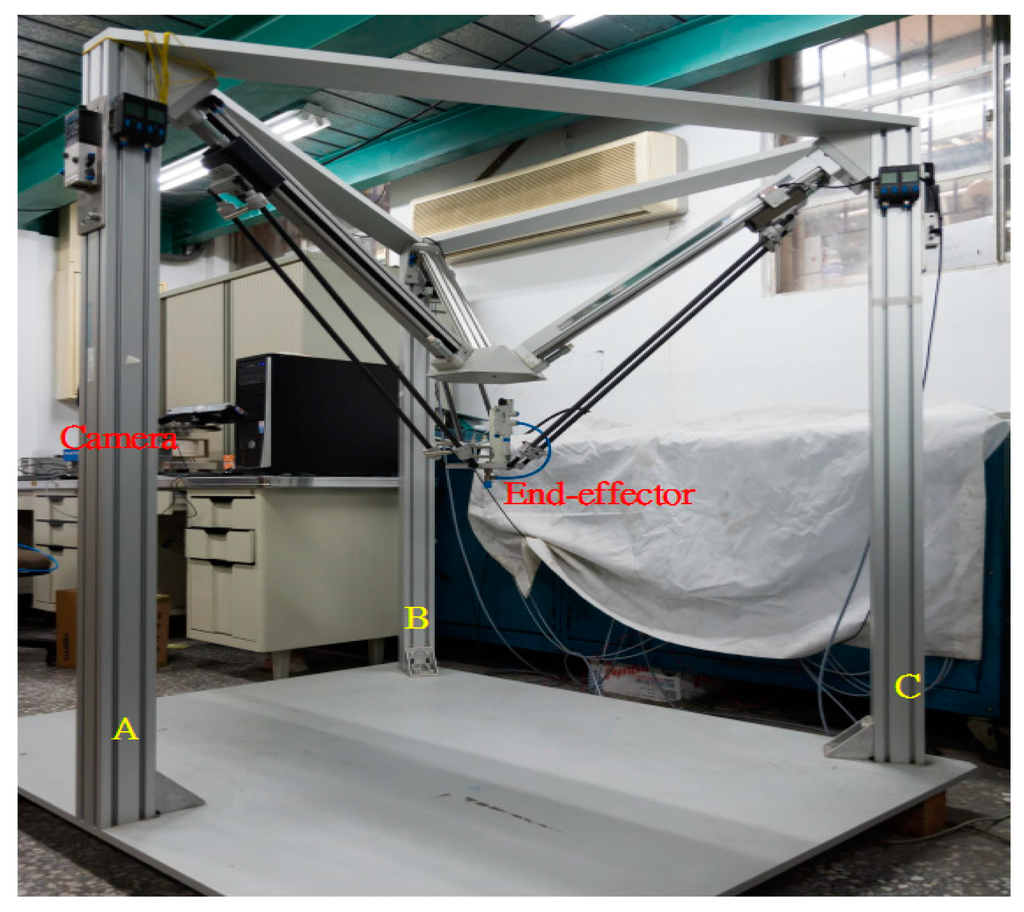 In recent years, more and more countries have developed various kinds of robots to render human’s lives much more convenient. Abundant literature on robots has been published and used for several decades. For instances, robots are widely adopted in automobile, mechanical, aerospace, medical applications. In this research, the industrial manipulator, the parallel manipulator, will be presented and implemented. This kind of manipulator possesses a high ratio of rigidity to weight, high stiffness, high accuracy and high response, so parallel manipulators have become more popular in diverse industries to handle complex and harsh tasks. In most robot application research, the interaction in the workspace between robots and workpieces is a critical issue. Especially, position mismatch may cause a failure of the functioning. In recent years, visual systems have become the most outstanding method applied in the robot-vision system. To achieve such vision-guided system, the robot should be able to recognize the target object and determine the pose of the object so as to grasp it. In 1988, the Harris corner detector was suggested for the feature detector [1]. Furthermore, the robot needs to modify its motion trajectory according to the target object’s poses. In 2011, the 3D parallel mechanism robot with a stereo vision measurement system was presented by Chiang et al. [2,3]. The stereo vision measurement system is a noncontact measuring strategy using two parallel CCDs to capture the 3D poses of the end-effector instead of the contact displacement sensors. The system can determine the location of the end-effector in the three-dimensional Cartesian coordinate system. In 2016, the 3D visual data-driven spatiotemporal deformations for non-rigid object gasping using robot hands was introduced by Mateo et al. [4]. The experiments show that the proposed method can grasp several objects in various configurations.