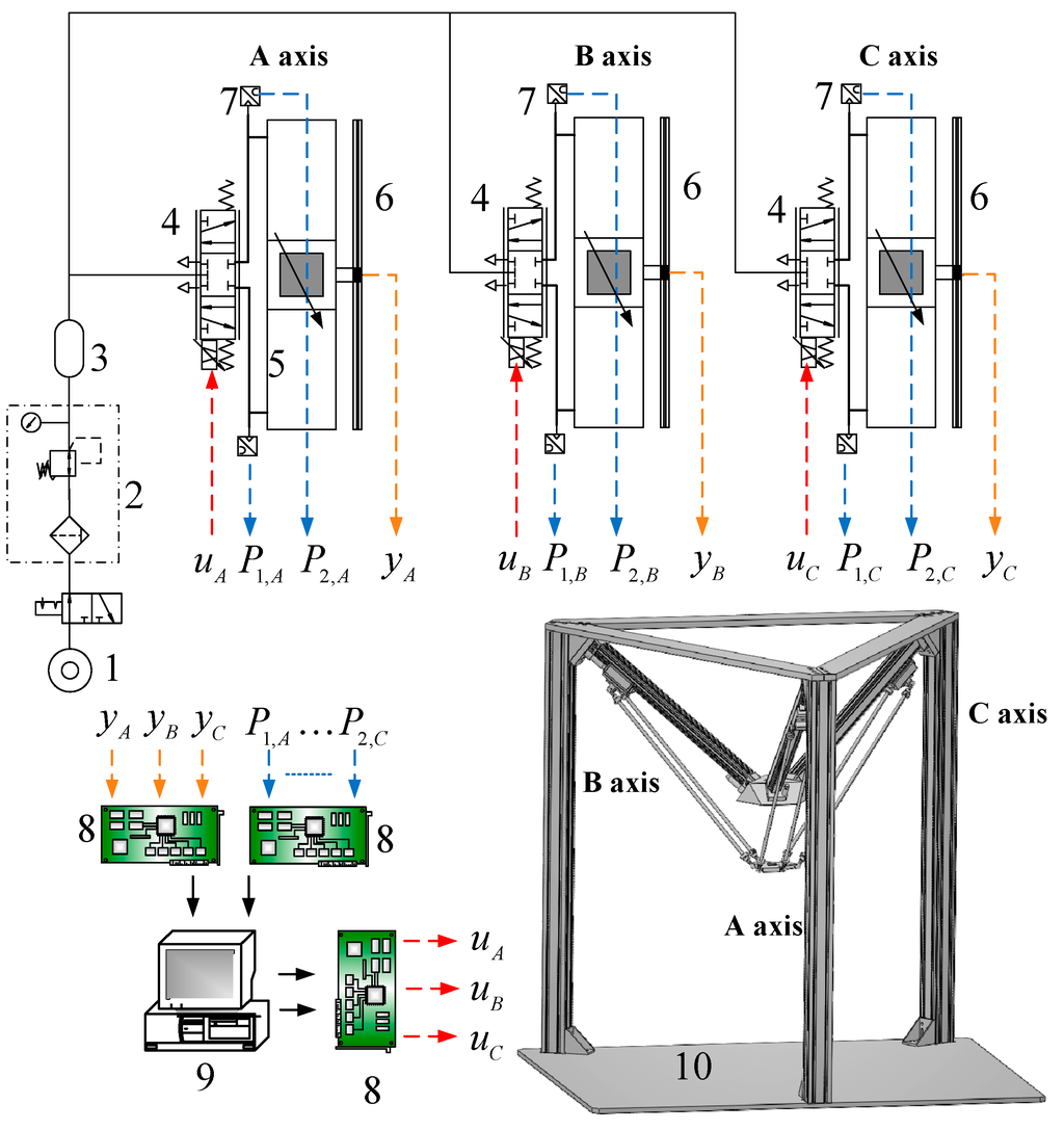 Test rig layout of the 3-DOF pneumatic parallel manipulator. 1: Air Pump; 2: Air Preparation Unit; 3: Air Reservoir; 4: proportional directional control valve; 5: pneumatic rod-less cylinder; 6: optical linear encoder; 7: pressure sensor; 8: interface card; 9: PC-based controller; 10: 3-DOF pneumatic parallel manipulator.