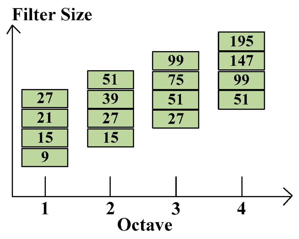 Feature of interest points are located in various scales and an image pyramid can realize scale spaces. Lowe [10] proposed that cutting pyramid layers can find the edges and blobs of images. The scale space can separate into octaves which denote filter response maps from convolving the same image in different size filter. Each octave has a constant ratio for scale levels, so the layer can be determined by calculating determinant of approximated Hessian matrix of the same input image in growing size filter. Figure 4 shows the relation between each octave and various filter sizes. Note that the octaves are overlapping in order to cover all possible scales seamlessly. The layer denotes a series of filter response maps obtained by calculating determinant of approximated Hessian matrix of the same input image with a filter of increasing size in each octave.