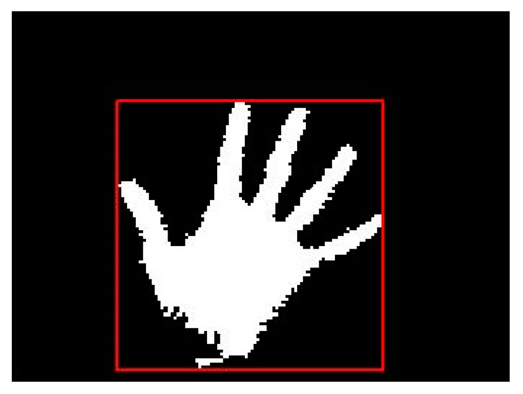 In a general environment situation, we can’t guarantee the image background will be clear. There will be some skin-like objects in the image, which produce unexpected noise. In that case, we use an area condition to filter out noises. First, we calculate the pixel area of each connected component by Equation (10) as follows: