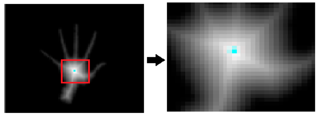 The distance transform means that the distance from the boundary to a pixel in the hand region increases as the pixel is away from the boundary [15]. Using this distance value, the centroid of the palm region can be calculated. Figure 8 (left) shows the image of the hand after applying the distance transform. The right image of Figure 8 demonstrates the enlarged view of the region within the red rectangle.