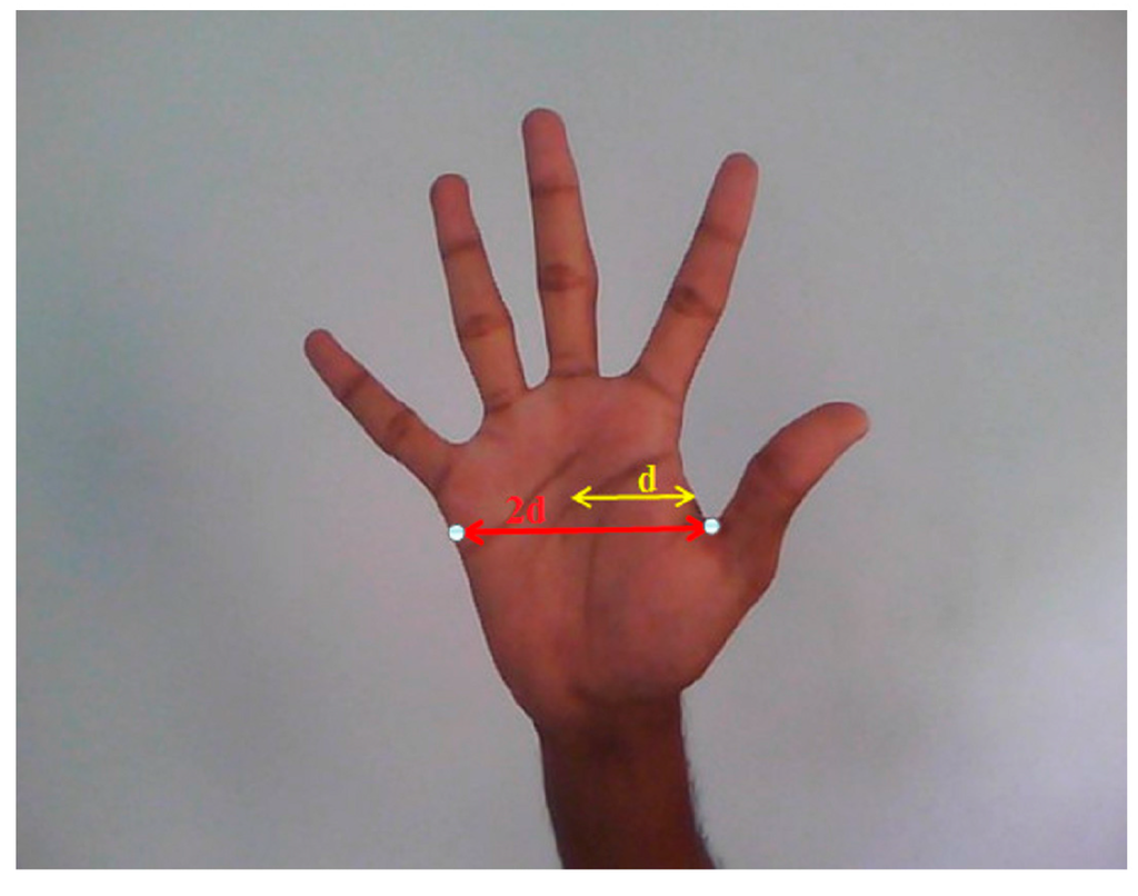 The width of the hand region will be approximately twice the distance from centroid to the nearest boundary pixel as shown in Figure 9.