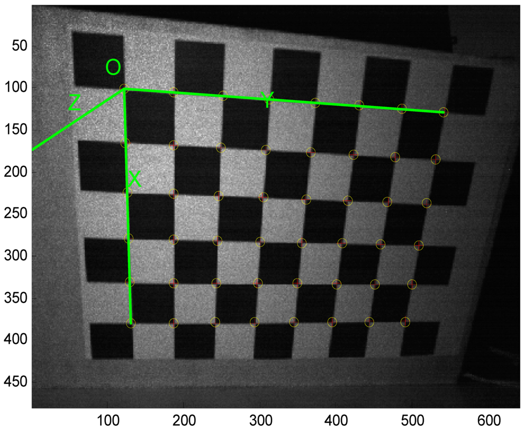 Bouguet adapted the calibration method of Zhang [16] which employs a chessboard to be the calibration pattern. Figure 12 shows the corner extraction process. “+” is for image points and “o” is for re-projected grid points.