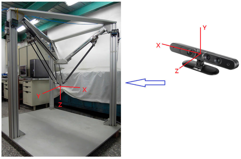 Xtion Pro Live was introduced and implemented for measuring the 3-D locations of target points. Furthermore, we developed a coordinate transform calibration method for eye-to-hand calibration using the least squares and pseudo inverse methods.