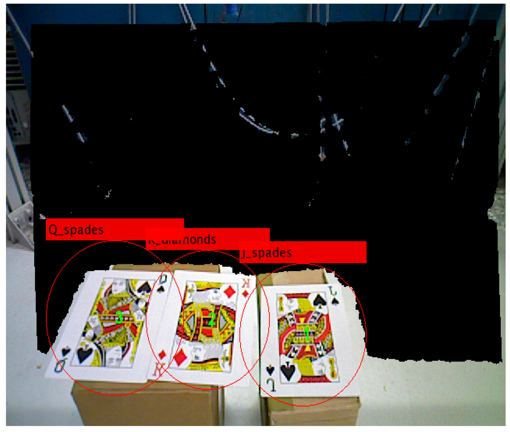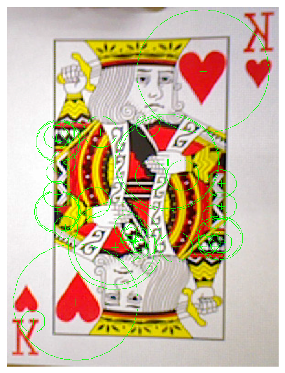 We use poker K, Q and J patterns to construct the database and applied six scale levels in the 3th octave for feature extraction. The king of hearts result is shown in Figure 16. The green crosses denote feature points locations and circles are feature points found in different scale space with 6 s radius. Figure 17 and Figure 18 illustrate the results of the RANSAC algorithm applied to find the inlier correspondences and recognized patterns.