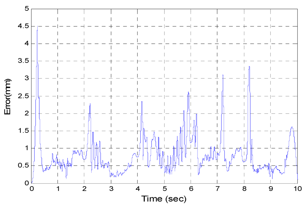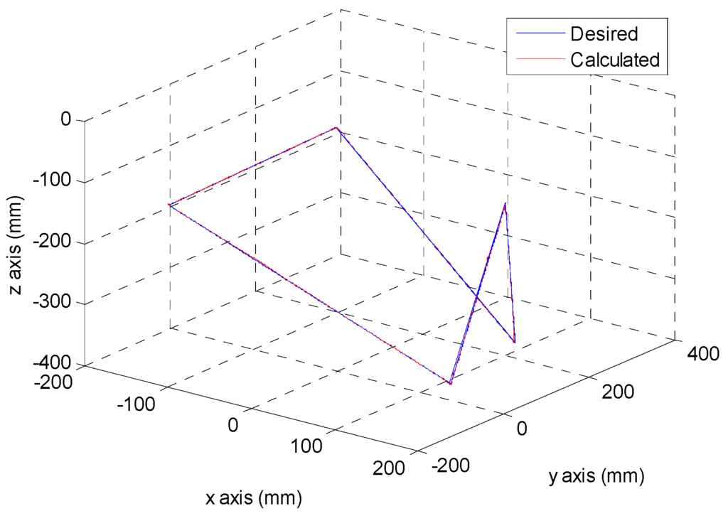 After the poker pattern is recognized by the SURF feature point detection with the RANSAC algorithm and the user selects the targets for grasping by counting active fingers, the depth camera will estimate the center of each targets in the end-effector frame by the coordinate transform from the camera frame. Once the pick and place locations are calculated, the program will automatically generate the customized 5th order trajectory of the end-effector for path tracking control. The experiments are from (X, Y, Z) = (−150, −100, −150) mm back to (0, 0, 0) mm in 2 s. The red line of Figure 19 illustrates the estimated trajectory of the end-effector calculated by the forward kinematics and experimental tracking responses of three actuators. Figure 20 demonstrates the trajectory tracking error of the end-effector for 3-DOF pneumatic parallel manipulator. Figure 21, Figure 22 and Figure 23 show the experimental results of each actuator’s responses, respectively.