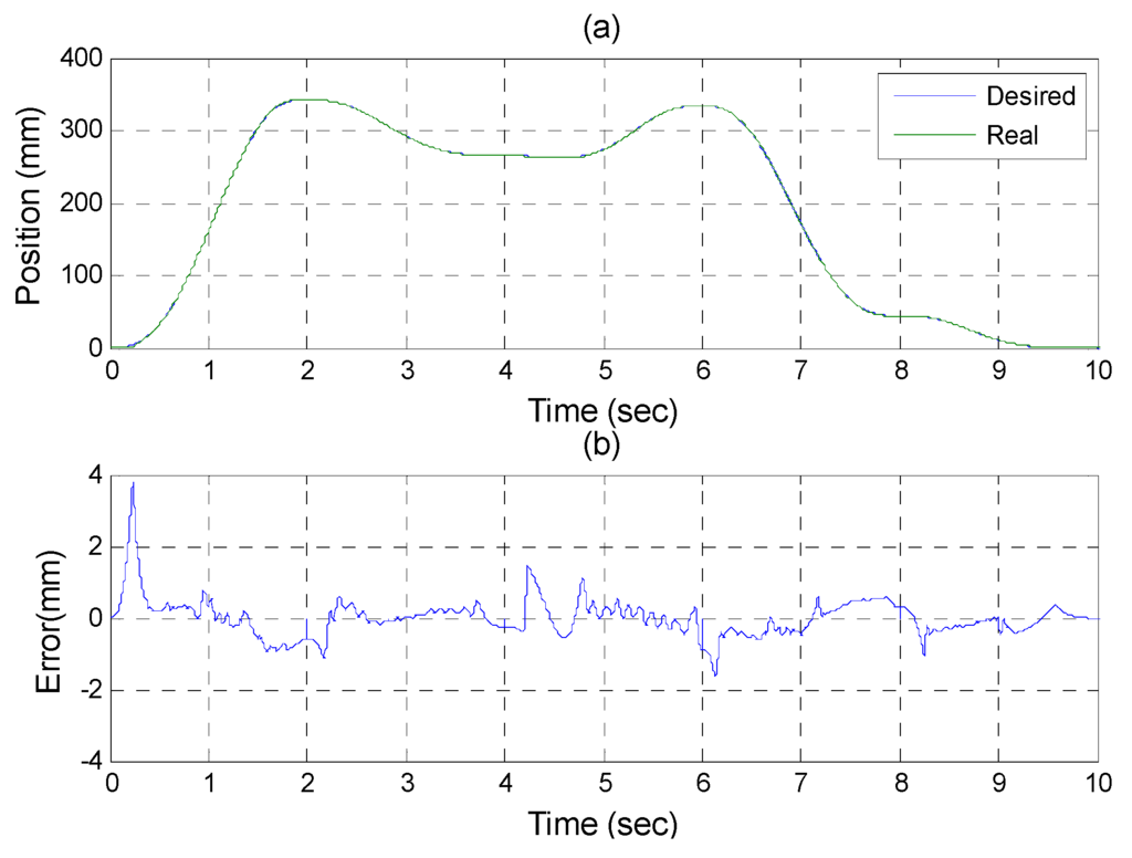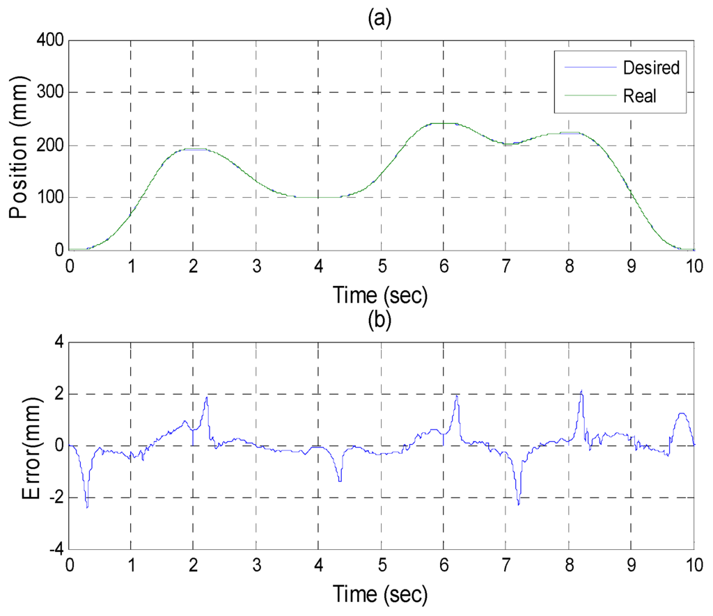 Experiments for A axis cylinder (a) tracking responses (b) tracking errors.