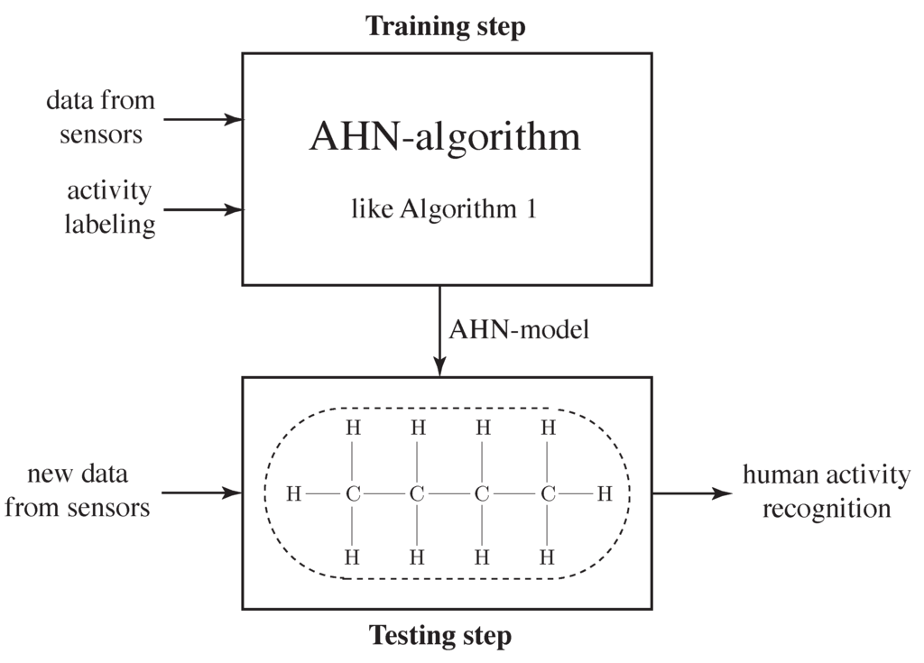 Diagram of the proposed artificial hydrocarbon network-based classifier (AHN classifier). First, data from sensors and activity labeling are used for training the AHN-model, then it is used as the AHN classifier in the testing step.