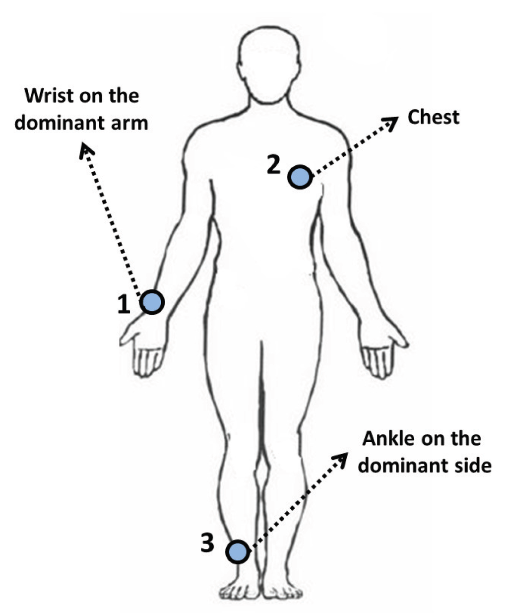 Location of the three wearable sensors used in the dataset (hand, chest and ankle), adapted from [21].