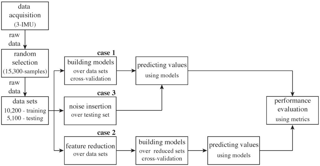 Noisy data are often provided in machine learning processes, making it more difficult to obtain accurate models for real problems [8]. Different types of noise can also be found in the human activity recognition classification process. Input features may have noise for several reasons, such as: (1) sensor miscalibration; (2) dead or blocked sensors; (3) errors in sensor placement; (4) activities registered in noisy environments; (5) activities interleaved, so that the events are not only related to one activity. Classification labels in the output class need human intervention, and it is therefore likely to have errors, as well. As in other classification problems, noise can be located in training and/or test data.