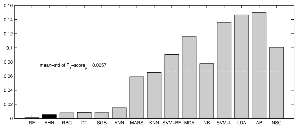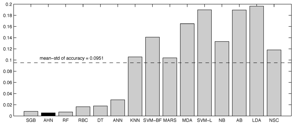 The supervised classifiers used are the following: stochastic gradient boosting (SGB), AdaBoost (AB), C4.5 decision trees (DT), rule-based classifier (RBC), support vector machines with linear kernel (SVM-L), support vector machines with basis function kernel (SVM-BF), random forest (RF), k-nearest neighbors (KNN), linear discriminant analysis (LDA), mixture discriminant analysis (MDA), multivariate adaptive regression splines (MARS), naive Bayes (NB), multilayer feedforward artificial neural networks (ANN) and nearest shrunken centroids (NSC). Selection criteria of these techniques are supported in the reviewed literature [2,9,10,11].