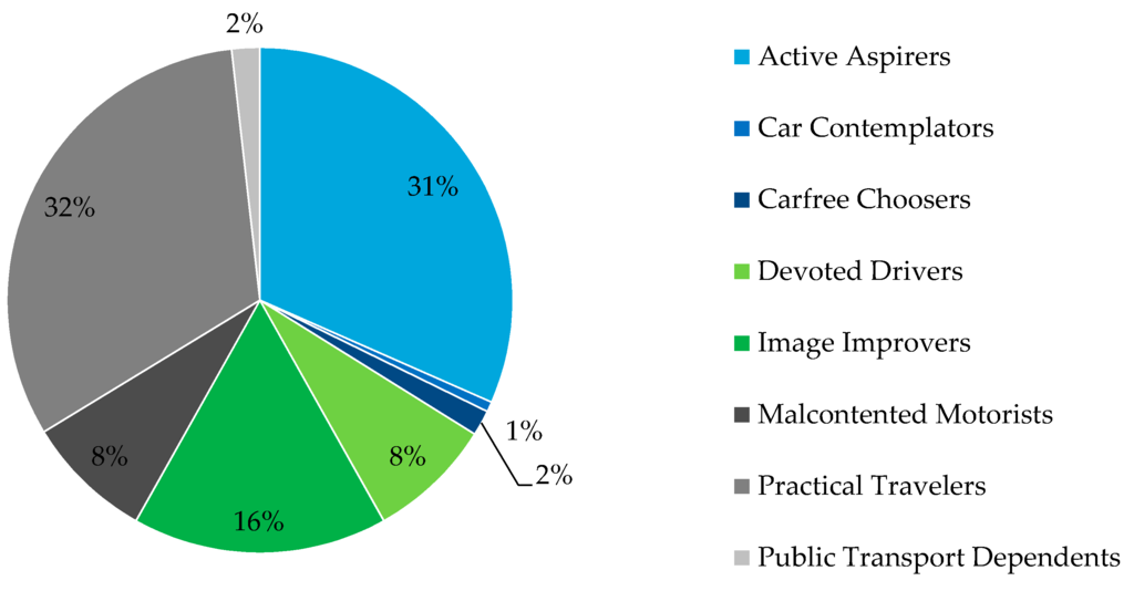 Based on the ‘Golden questions’ survey results, the most represented attitudinal profiles in our sample were Practical Travelers and Active Aspirers and the least Car Contemplators (Table 1) (Figure 3).