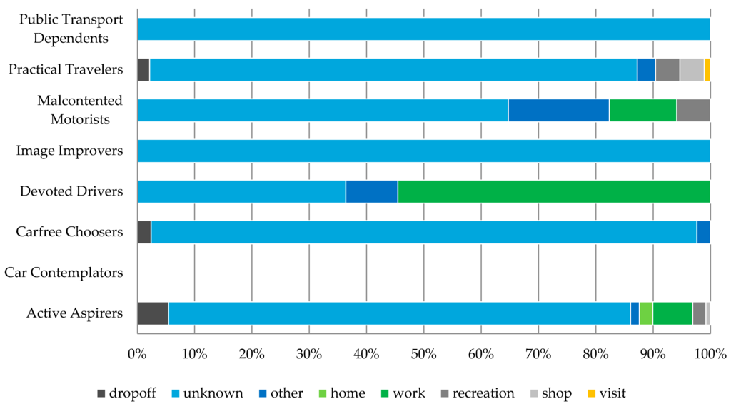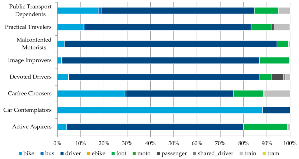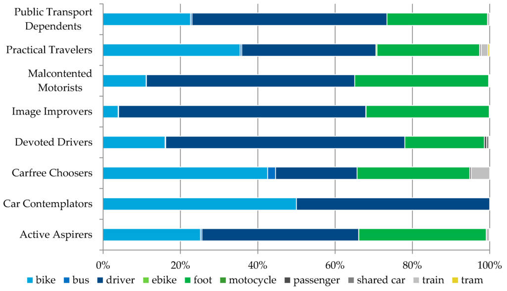 - Car-free Choosers—They consider that cars lead to unhealthy lifestyles and do not like to drive. They prefer cycling as they feel a high moral obligation to the environment. Alternatively, they will choose public transport, which they do not consider to be stressful nor problematic, and walking. They are more likely to be women.
