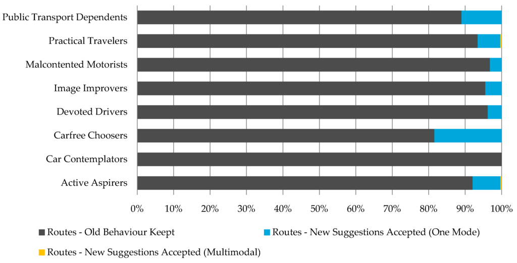 By comparing the usual mobility behavior with the alternative route suggestions acceptance we were able to observe how keen members of each attitudinal profile are to accept alternative route incentives (Figure 10) and change their behavior. In addition, we observed that only Practical Travelers and Active Aspirers tried new multimodal routes while the rest have utilized single transportation mode options. Of all the observed behavioral changes (trips not made with usual mode choice) more than 40% were repeated multiple times, ranging up to repeating the alternative route suggestion 85 times (Figure 11).