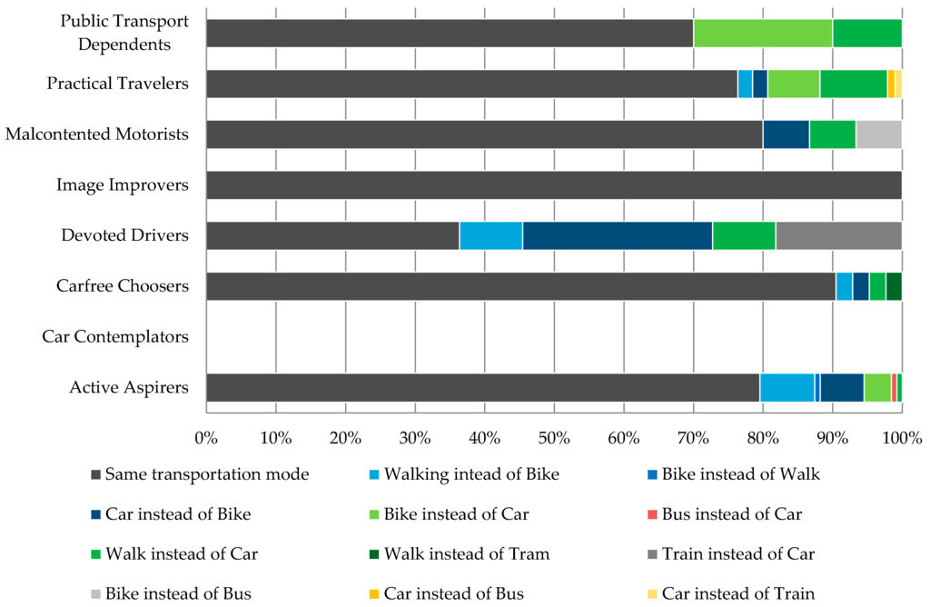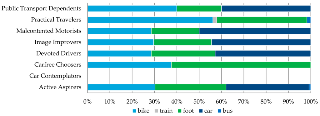 - Practical Travelers—They are confident that they are using a balanced amount of each transportation mode. Therefore they do not intend to reduce car use, although they think it reduces the quality of life, as they believe they are using it only when necessary. They prefer cycling over the use of public transportation as they consider it to be quicker and not stressful. They walk when it seems more practical than cycling and see local pollution and congestion as issues but are not motivated by climate change. They are highly educated and above-average part-time working.