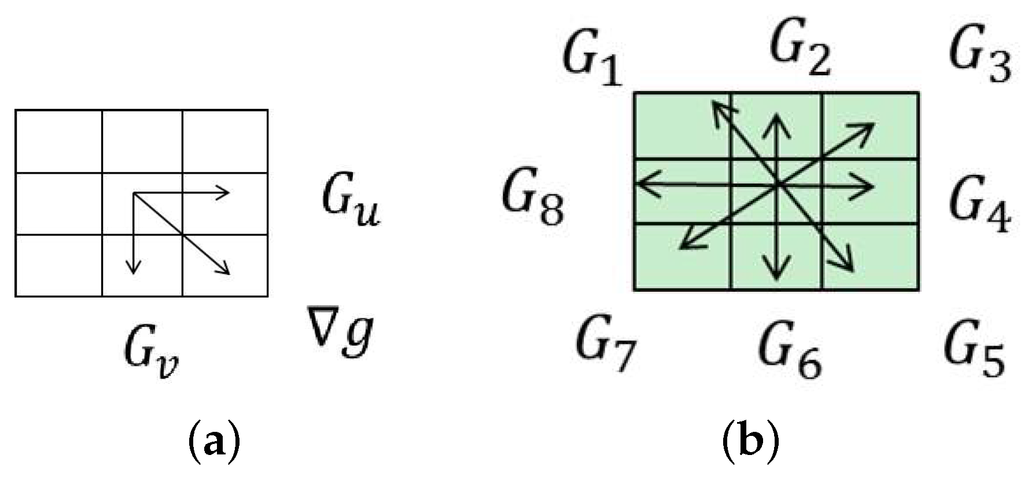 The traditional image gradient calculation methods, such as Figure 2a, which only concern the pixel-wise differences in two directions, cannot deal with the rotation motion blurring. In order to reduce the efforts of the relative rotation between cameras and objects, we present an improved image gradient calculation method, as shown in Figure 2b. In our method, we calculate the differences (denoted as ) along the eight directions for the center point of within the range of 3 × 3 pixels, and we take the maximum absolute value of those differences in eight directions as the gradient on . In order to reduce the interference of colors, we only use the Y channel in YUV color space that emphasizes the brightness channel, and the gradient in Y channel is denoted as , calculated with Formula (2).