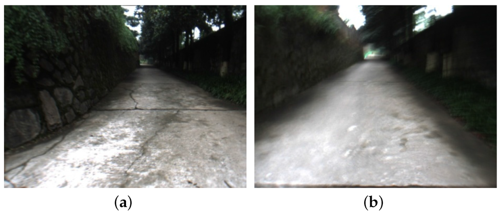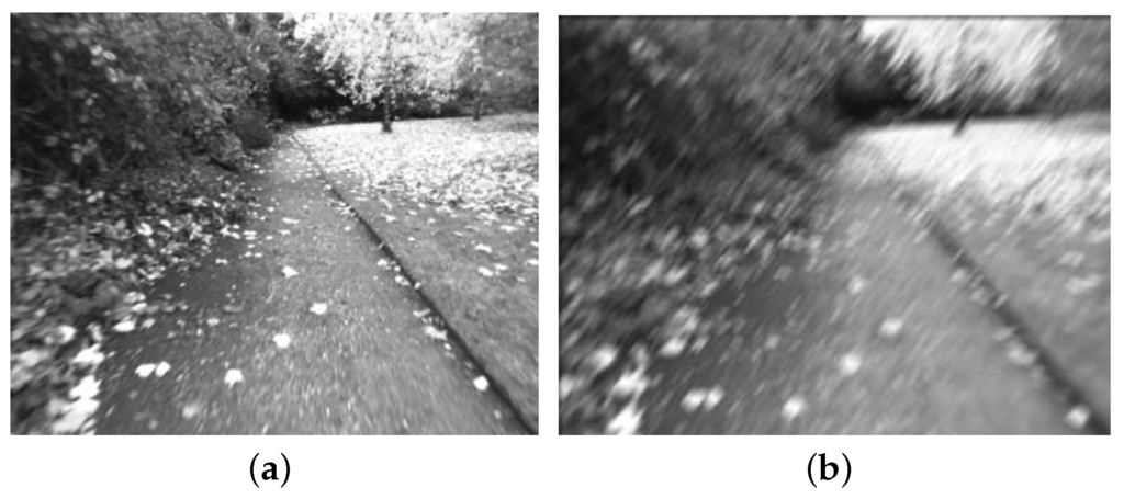 The most related work is the robust visual odometry framework for blurred image presented by Alberto Pretto et al. [14]. In that framework, the kernels’ parameters of the blurred images caused by the motions are estimated firstly, then those parameters are combined into the SIFT based feature detection to improve the accuracy of feature points. To reduce the damage on the feature points’ accuracy caused by the motion blurring, Alberto Pretto’s method keeps the parameters of the Gaussian filter orthogonalized with the direction of the motion unchanged, and the parameters of the Gaussian filter paralleled with the direction of the blur motion are solved with iterative method. This method can reduce the effects of the motion blurred images on visual odometry in a certain degree, but it is limited to the rectilinear motion blurred images and Gaussian filter based feature detection methods. There are other kinds of image blurring, such as the focusing blur, nonlinear motion blur, etc., all of these are beyond the scope of their framework. In addition, there are also many different feature detection methods [4], such as Harris corner detection, FAST corner detection, all of these detectors cannot be used in their framework. Furthermore, their method employs the Levenberg-Marquardt Algorithm (LMA) to search a suitable Gaussian standard deviation, the optimization results of LMA are great affected by the initial values, thus it may lead to varied results when the input initial values are slightly changed.