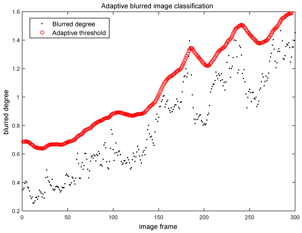 The classification results on the real captured data set are shown in Figure 12. Each black point in Figure 12 represents the blurred degree of the current frame calculated by Algorithm 1. Each red circle in Figure 12 represents the adaptive threshold for the current frame output by Algorithm 2.