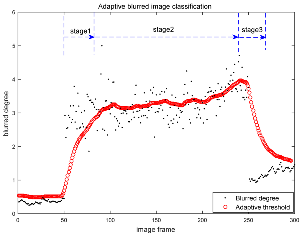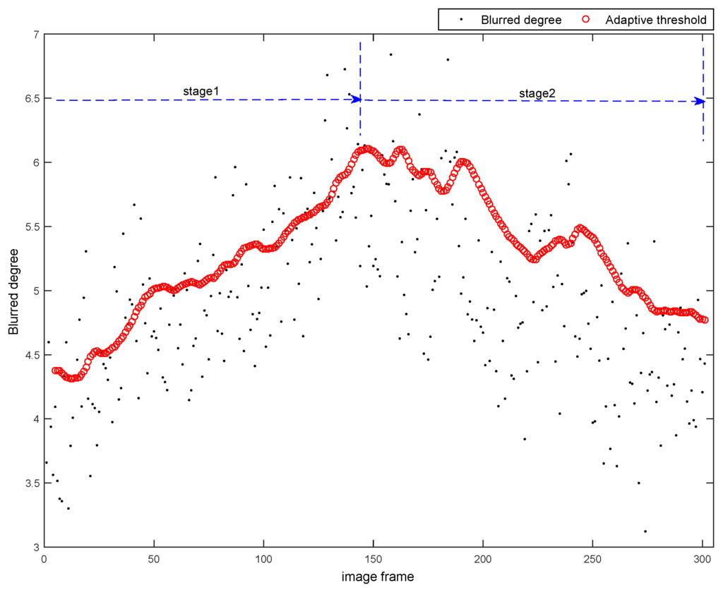 The Figure 12 shows that the blurred degrees are increasing in the stage 1 and decreasing in the stage 2, which are corresponding to the platform’s downhill (acceleration) and uphill (deceleration) motions. During the stage 1, the thresholds calculated by Algorithm 2 are increased with the growth of the blurred degrees due to the acceleration of the platform. Thus our Algorithm 2 can keep the relative clear images into the C1 and reject the relative blurred images. Similarly, in the stage 2, the thresholds calculated by Algorithm 2 are decreased with the drop of the blurred degrees due to the deceleration of the platform. Our algorithm can also keep the relative clear images into the C1 and reject the relative blurred images.