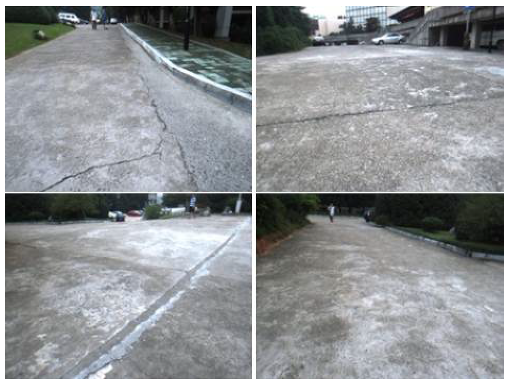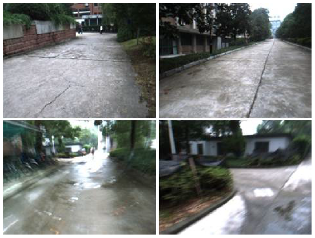 In this section, we also carry out the evaluation experiment for Algorithm 2 in real captured dataset. We use a small platform, shown in Figure 10, to walk in our campus and capture a set of image frames. In the ahead of these image frames, the platform walks downhill, in the later of these image frames, the platform walks uphill. As the road is quite rough, there are many blurred images in this image sequence, some samples are shown in Figure 11.