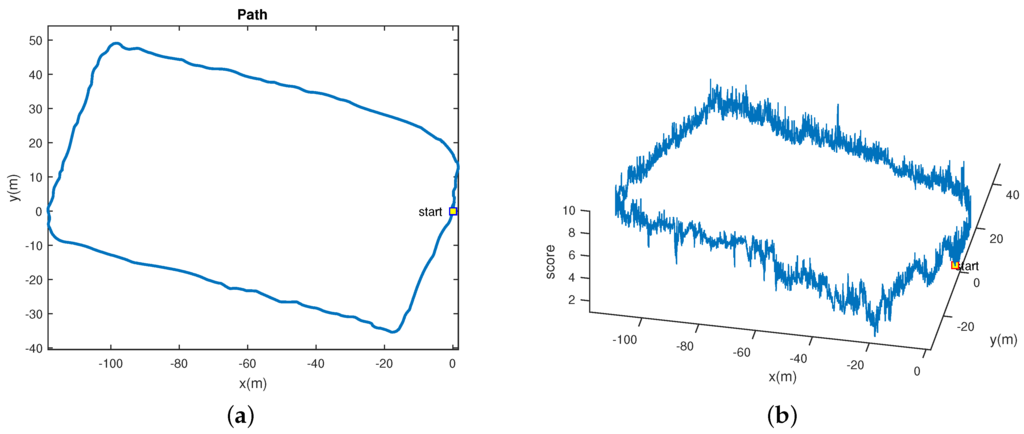 The visualization of the path for the robot walking on dataset2. The third coordinate (`score’) displays the SIGD value of each frame in the path. (a) Path in two dimension; (b) Path with SIGD.