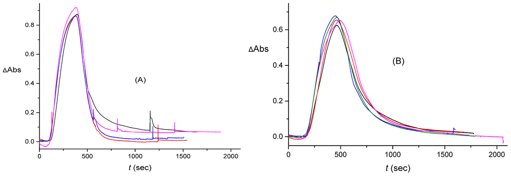 Example of the output signal, , measured as the change of the absorbance (with respect to the background) in the cuvette as a function of time. (A) Four different experiments for the rectangular input pulse; (B) Five experiments for the triangular input pulse. Both data sets were obtained without the enzymatic reaction. The optical absorbance was measured at λ = 420 nm, corresponding to λmax in the absorbance spectrum of [Fe(CN)6]3−.