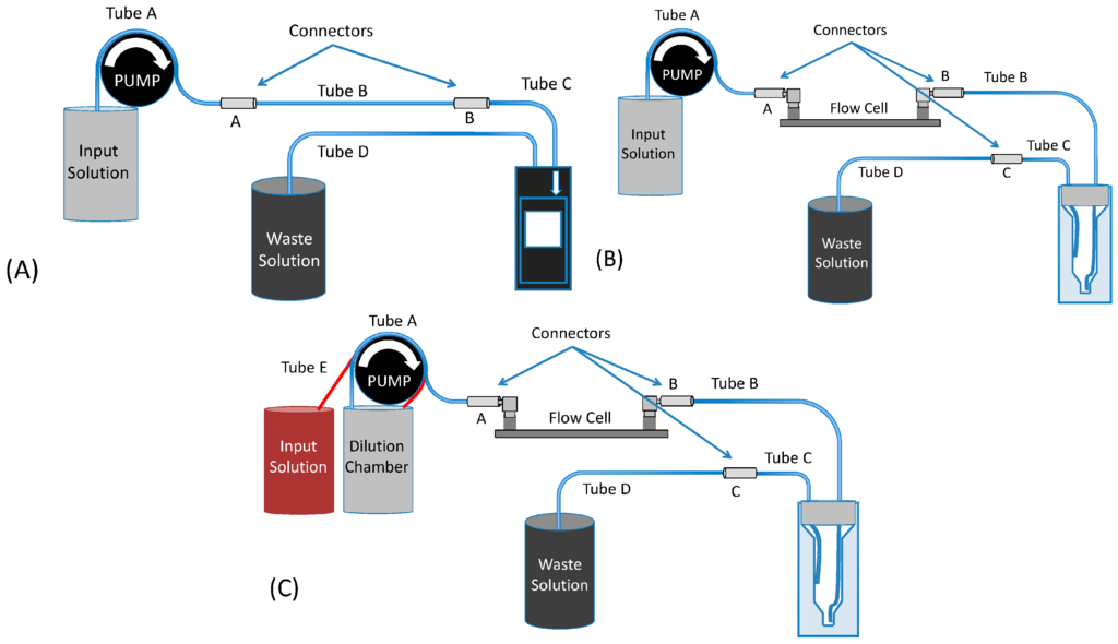 Flow system design. (A) The input solution is pumped through Tube A (length l = 39 cm, diameter d = 0.5 mm), through Tubes B (l = 22.5 cm, d = 1.0 mm) and C (l = 10 cm, d = 1.0 mm), and into the commercially available (shown here) flow-through cuvette, exiting via Tube D (l = 50 cm, d = 1.0 mm); (B) A flow cell with immobilized enzyme was added into the system, with the lab-made cuvette used (shown here). Note that the cell is rather small (see Subsection 2.5) in all its dimensions, and is exaggerated here. Tubes A, B and C parameters here are the same as before (but they are differently connected). Connector C provides the mechanical stability needed to control the positioning of the outflow tube C and thus keep the volume of the liquid in the cuvette constant; (C) A dilution chamber was added to allow the input of a “triangular” pulse. The input solution is pumped through Tube E (l = 39 cm, d = 0.5 mm) into the dilution chamber. Simultaneously, Tube A is used to pump the solution out of the dilution chamber via the same pump.