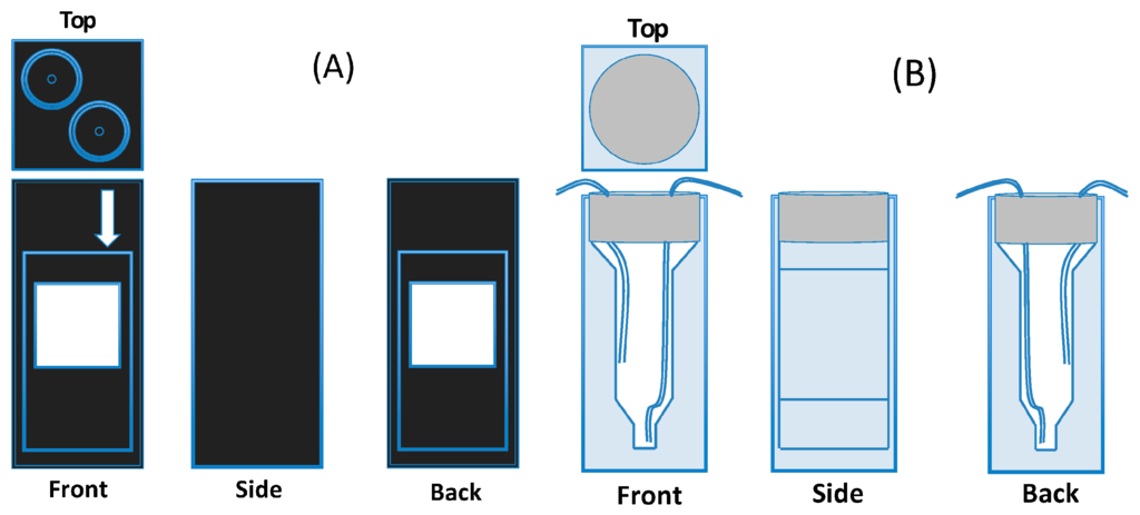 (A) The commercially available flow-through cuvette. This cuvette utilizes two threaded connectors at the top of the chamber to keep the vessel pressure sealed. The inflow pipe, marked by the arrow on the sketch, is plumed to feed the visible chamber from the bottom, with the outflow being plumed into the top of the cuvette’s chamber. The internal volume of the cuvette is ; (B) The lab-made tunable cuvette. It was made by utilizing disposable plastic cuvettes for the basic structure and is sealed using a rubber septum. The septum allows for the inflow and outflow pipes to have their depth manually set to tune the volume of the trapped air and thus also the volume of the liquid in cuvette.