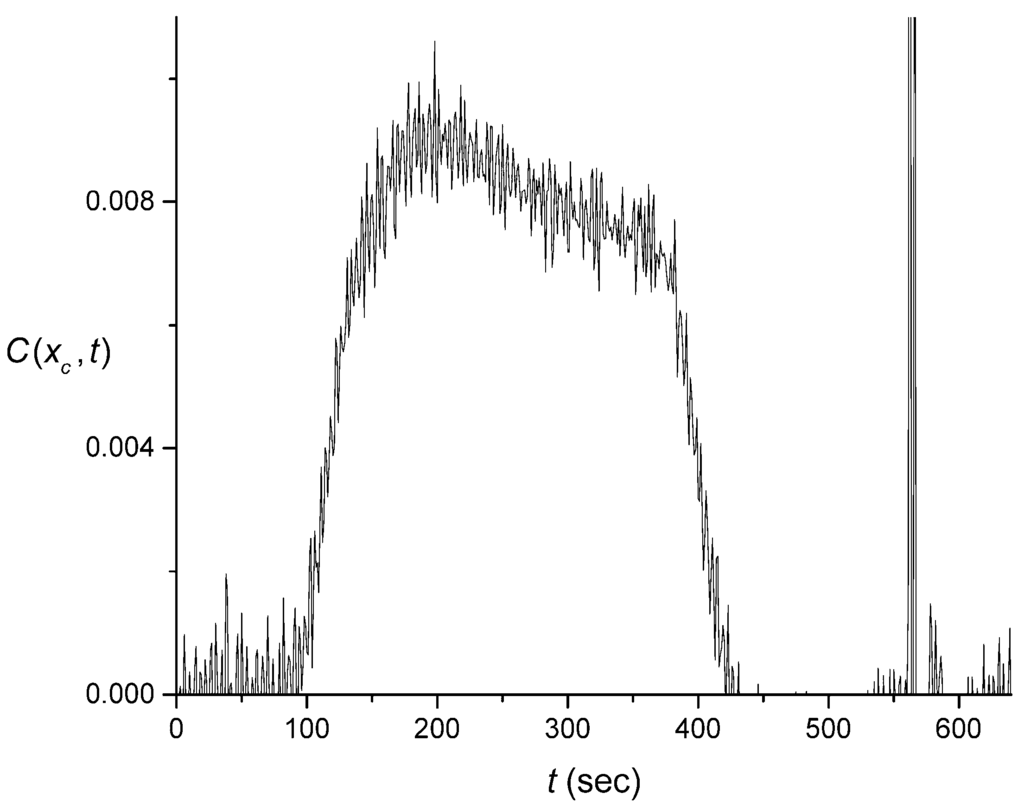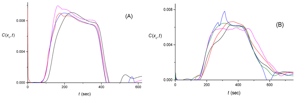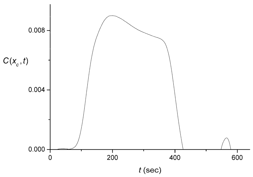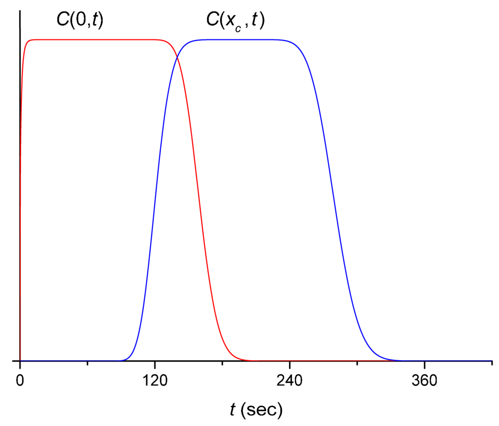 where is the diffusion constant of ferricyanide [74]. For our values of in the wider tubes (slower flow) varying in the range of 0.09 to 0.12 cm/s, the length of the tubes totaling from 80 to 124.5 cm forming the flow channel, and the pulse duration of 330 s, the diffusional spreading of the pulse was found to be relatively small. This is illustrated by solving Equation (1) numerically: see Figure 4, where we took typical parameters for a slower-flow (wider) tube and assumed an approximately rectangular input pulse, which is in itself already somewhat spread out by the injection process.