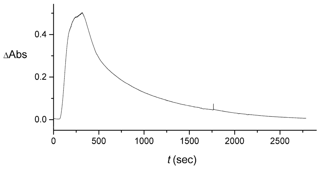 As will be shown in Section 4, all the aforementioned sources of noise and uncertainty in the signal are actually much more pronounced in the input into the cuvette, , The measured signal , which is proportional to the change in the absorbance at 420 nm, involves a certain averaging due to mixing in the cuvette, as modelled in Section 3. The tradeoff, however, is that the shape of the output signal in Figure 1 does not looks as that dissimilar for the rectangular and triangular inputs. As a result, it may be deduced that is not well suited for analog information/signal processing, because it does not clearly reflects the original pulse shape, which, as will be argued in Section 4, should not be significantly distorted on transport in the channel, from to . The signal can only be used as a digital overall-intensity- or peak-intensity-based measure, exemplified as Yes/No (On/Off), for the presence/absence of the signal.