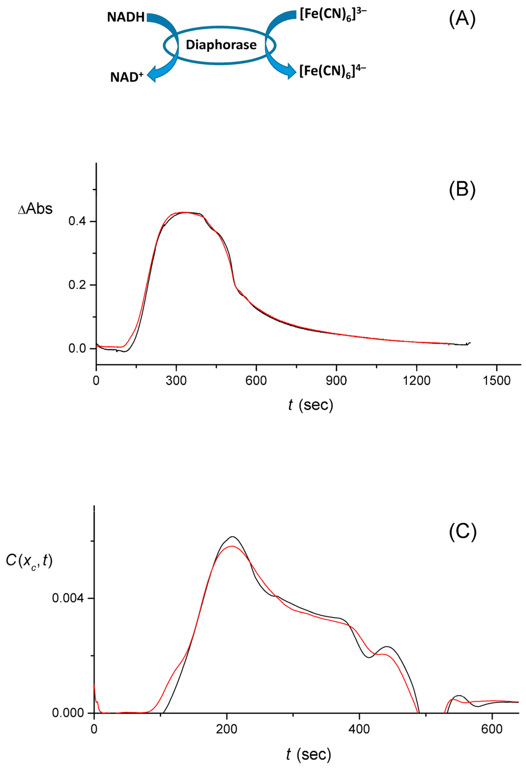 (A) Schematics of the ferricyanide, [Fe(CN)6]3−, being reduced by NADH, in a process biocatalyzed by diaphorase. The reaction products are β-nicotinamide adenine dinucleotide (NAD+, oxidized form) and ferrocyanide, [Fe(CN)6]4−. Note that the optical absorbance (λmax = 420 nm) decreases upon reduction of [Fe(CN)6]3−; (B) Two experimentally measured signals, , for a rectangular pulse with the biocatalytic process ongoing (activated by adding 1 mM NADH); (C) Shows the numerically reconstructed input pulses, , generated from smoothed-out .