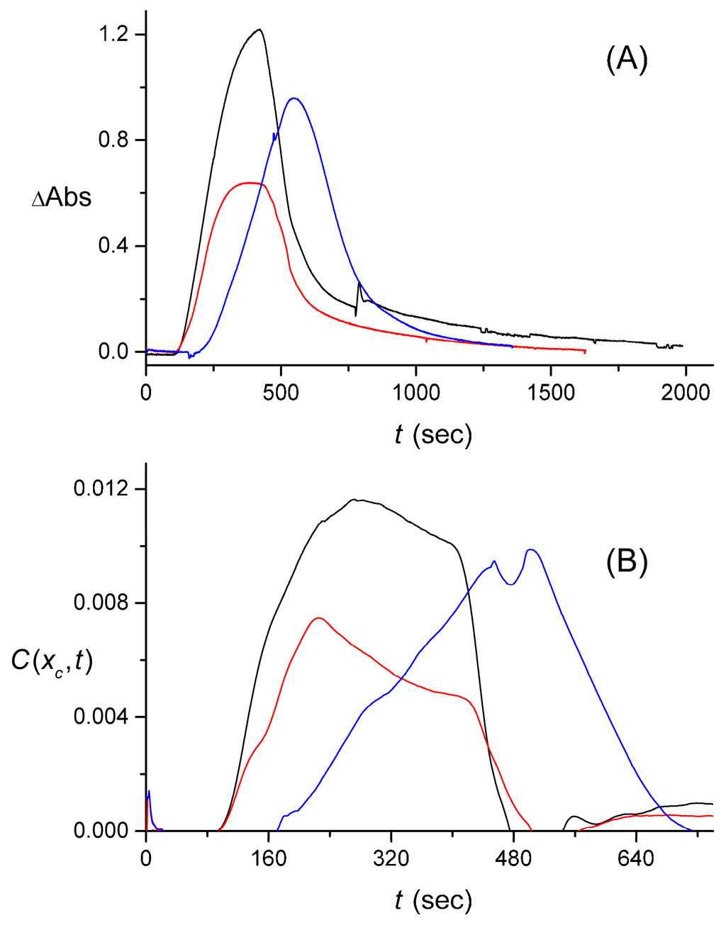 Experimental data measured using a cuvette of a relatively smaller volume. (A) Signals, , generated from rectangular (black) and triangular (blue) pulses without the enzymatic process, and from a rectangular pulse (red) with the enzymatic process ongoing; (B) The reconstructed input pulses, , shown with the same color coding, obtained from the three measured signals, , after the latter were smoothed out.