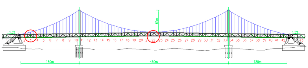 The primary bridge is a three-span, earth-anchored suspension bridge with a double tower. Its total span is 820 m with a primary span length of 460 m and side span lengths of 180 m each. The stiffening girder is a steel truss with a height of 10 m. There are 43 girders that must be hoisted. All girders are heavy and bulky steel truss structures with weights from 264.18 to 527.19 t. Girders in the side spans must be hoisted using a floating crane, and the girders in the middle span were lifted using two cranes stretched across the two primary cables. The hoisting procedures must be implemented in good weather and calm seas, and hoisting safety is an important factor that must be considered. The monitoring for hoisting is essential to make sure the safety, and can be realized in real-time and more convenient with the developed system. The elevation of the bridge is shown as Figure 1, and the girder numbers are labeled in red. In the following parts, the girders monitored were No. 3 in side-span and No. 22 in mid-span.