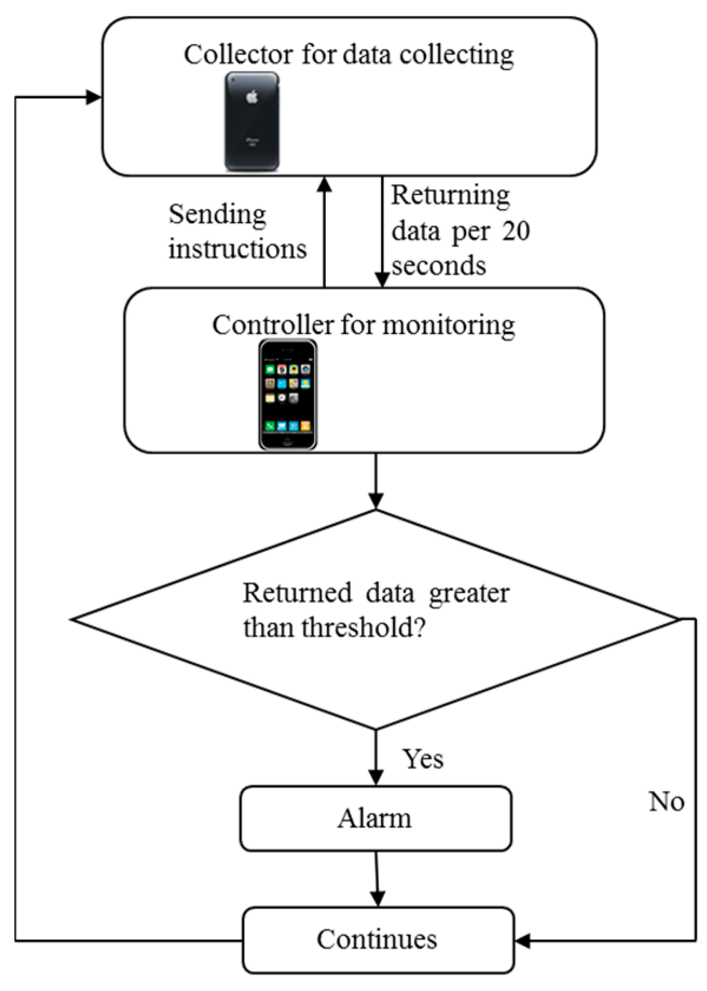 The controller sends instructions to a collector and observes the collected data. The collector collects monitoring data through its built-in sensors after receiving instructions from the controller and returns the data to the controller every 20 s. Once the current returned data exceeds a given threshold (e.g., the threshold of acceleration is 10 m/s2, and the threshold of angle is 10°), an alarm will be triggered on the controller iPhone, which then continues collecting and monitoring. The threshold can be set on the controller at any time according to operator experience and the requirements of the on-site conditions. The flowchart of this system is presented in Figure 2.