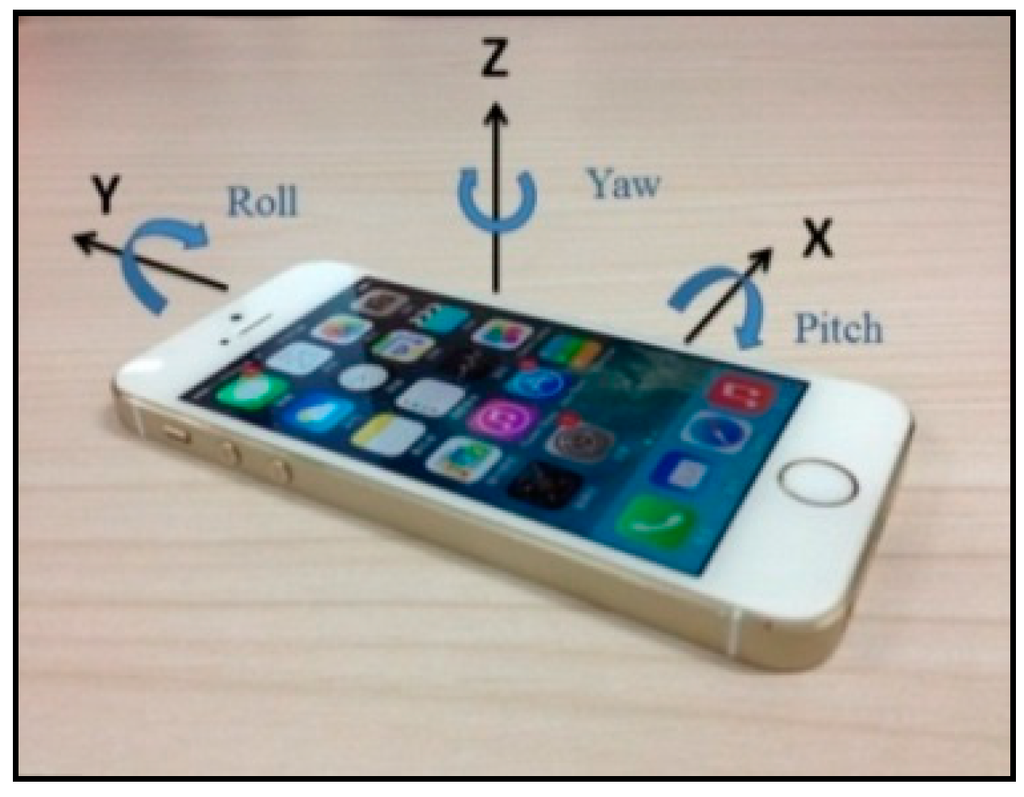 Based on the preceding characteristics, the basic performances of the accelerometer and gyroscope are stable, and these devices can thus satisfy engineering requirements in certain situations. The acceleration direction is specified as follows: regardless of the position of the phone, when the screen faces the user, the horizontal direction (i.e., left to right) is the positive direction of the x-axis, while the vertical direction (i.e., bottom to top) is the positive direction of the y-axis. The direction that faces the user is the positive direction of the z-axis, which is perpendicular to the phone’s screen. The acceleration directions are shown in Figure 3. To determine the angle, the data obtained by the gyroscope is categorized into three groups (i.e., pitch, roll, and yaw), which represent the rotation angles around the x-, y-, and z-axes, respectively. The angle-of-rotation directions are shown in Figure 4.
