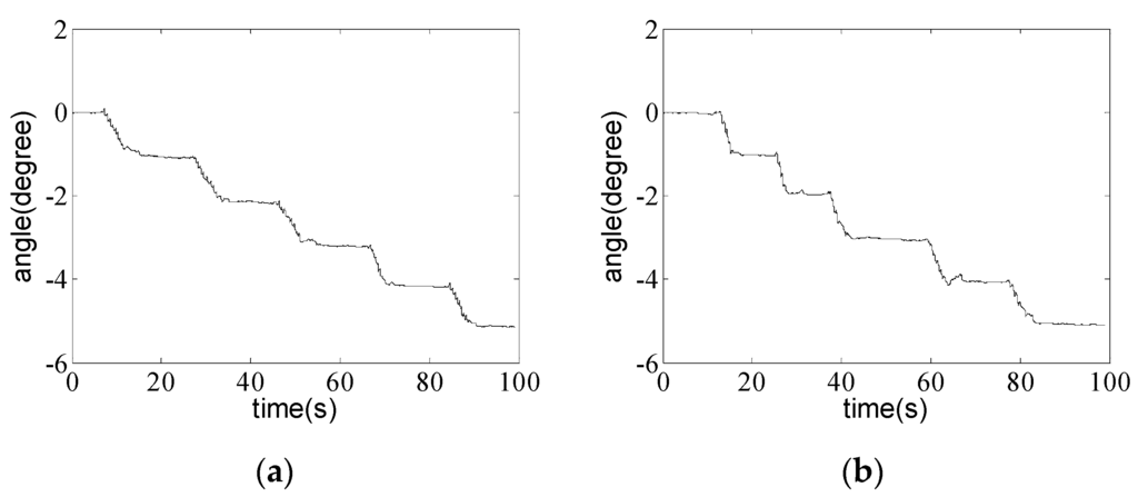 The angle instrument is fixed on the table, and the angle can be changed by turning the knob. The smartphone is fixed on the instrument, and moved with the instrument. Because of the dynamic angle data acquisition, slow manual angle loading, and low reading precise, step-by-step loading method is adopted in the experiment. Five loading steps are included in each test, one degree added every step by the angle instrument, and then keep static for several seconds, then goes to the next step. Take two experiments as examples, the angle around x-axis is shown in Figure 6a, and the angle around y-axis is shown in Figure 6b.
