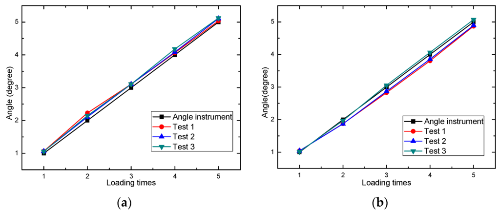 From Figure 7, it can be seen that the angle step coincides better with the instrument loading step. The error is inevitable because the angle on the instrument is loaded manually, and the reading is not so exact. Moreover, the loading in each experiment may be different to some extent, so the dynamic experiment was also conducted in [28]. The angle collected by the smartphone is compared to wired acquisition system and wireless sensing system, and the result proved the accuracy of angle acquisition using smartphone.