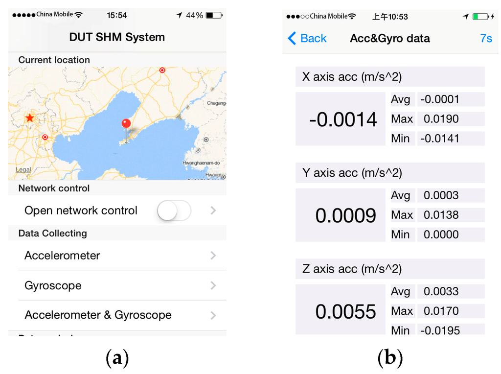 In recent years, smartphones have become popular on an unprecedented scale and can now be used as effective scientific tools. With an operating system, communication system and built-in sensors, they have already been applied to cyber-physical systems [8], including human health monitoring [9], vehicle maintenance services [10] and accident detection [11], motivation recognition [12,13,14,15], and structural health monitoring (SHM) [16,17,18,19,20,21,22,23,24]. Authors have also applied smartphones in the SHM field [25], in uses such as cable force monitoring [26,27,28], displacement monitoring [29], and earthquake rescue [30,31], etc. These applications allow the people to participate in the structural health perception process through the mobile phone and help people take corresponding measures to be safer.